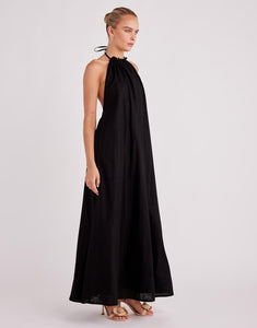 A wow black dress that is backless and sexy. The halter shape is a flattering silhouette and is a timeless style.