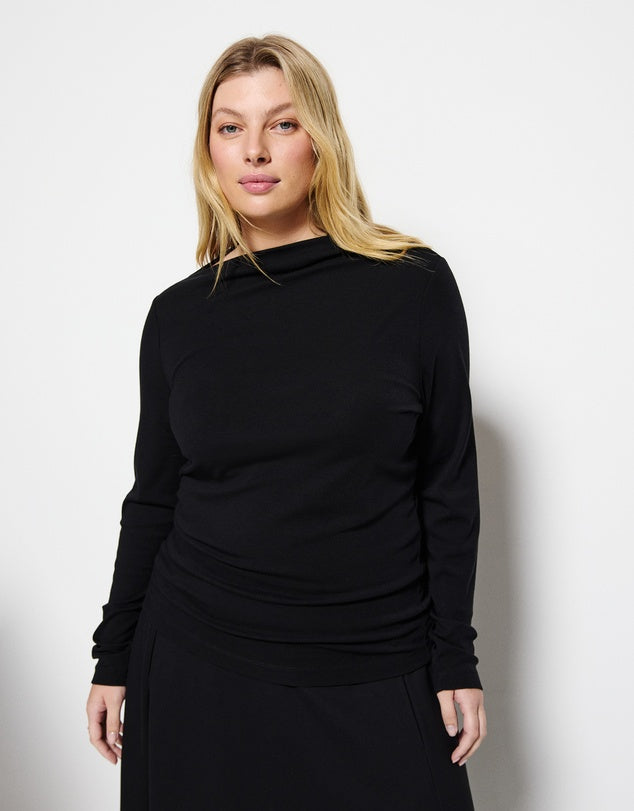 An asymmetric neckline turns this fitted top into a statement piece. Made in a stretch fabric for a sleek look, it's the perfect piece for layering under casual jackets
