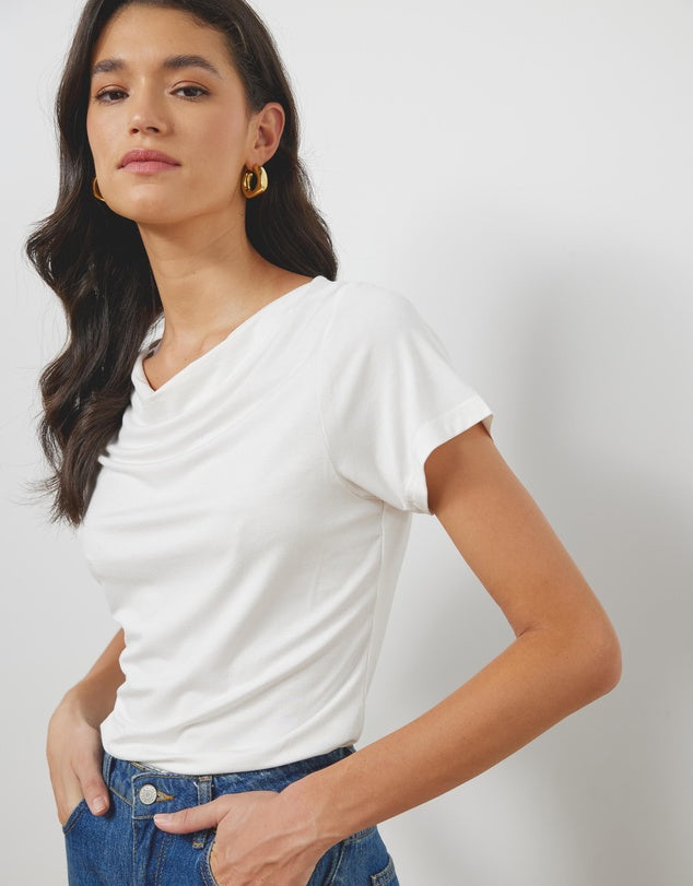 Core basic with a soft feminine touch. This top is made out of soft bamboo and has a draped effect. Consider it an elevated tee. Day to night.