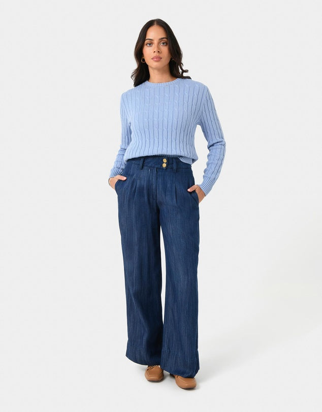 Cotton Cable Knit (powder blue) - add tailored pant and a belt for a relaxed corporate look. Dress this up with a blazer or trench coat.