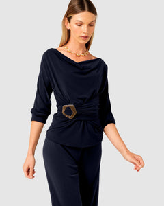 Cowl drape top in navy (buckle not included) - great for going out - simply pair with the jeans from this preview or even wear to work paired with the navy skirt. The tonal look will also assist at elongating the entire silhouette.