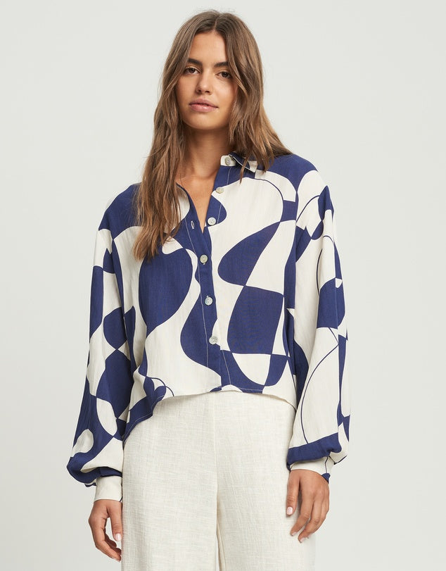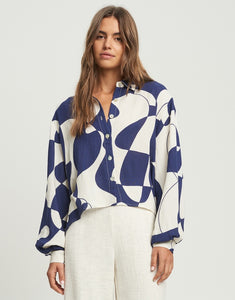 Relaxed blouse cut in a navy abstract print - Pearl-look buttons on the centre front placket and cuffs - Drop shoulder seams - Collared neckline, divine print loos great with pants, skirts or denim.