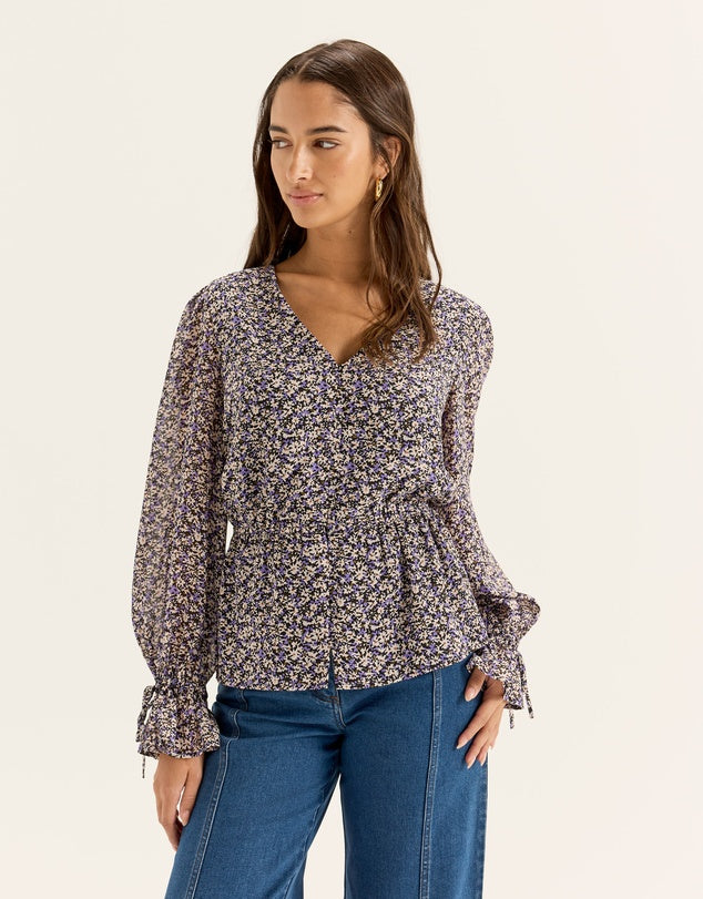 Relaxed printed blouse with a cinched in waist to highlight your natural waist