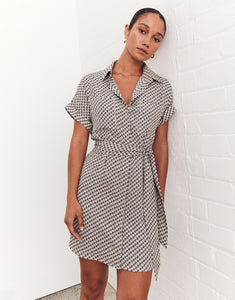 Woven Mini Length Dress (black,white,geo) beautiful fabrication and falls so nicely, very flattering. Add sandals for casual wear and heels with a blazer to dress up.